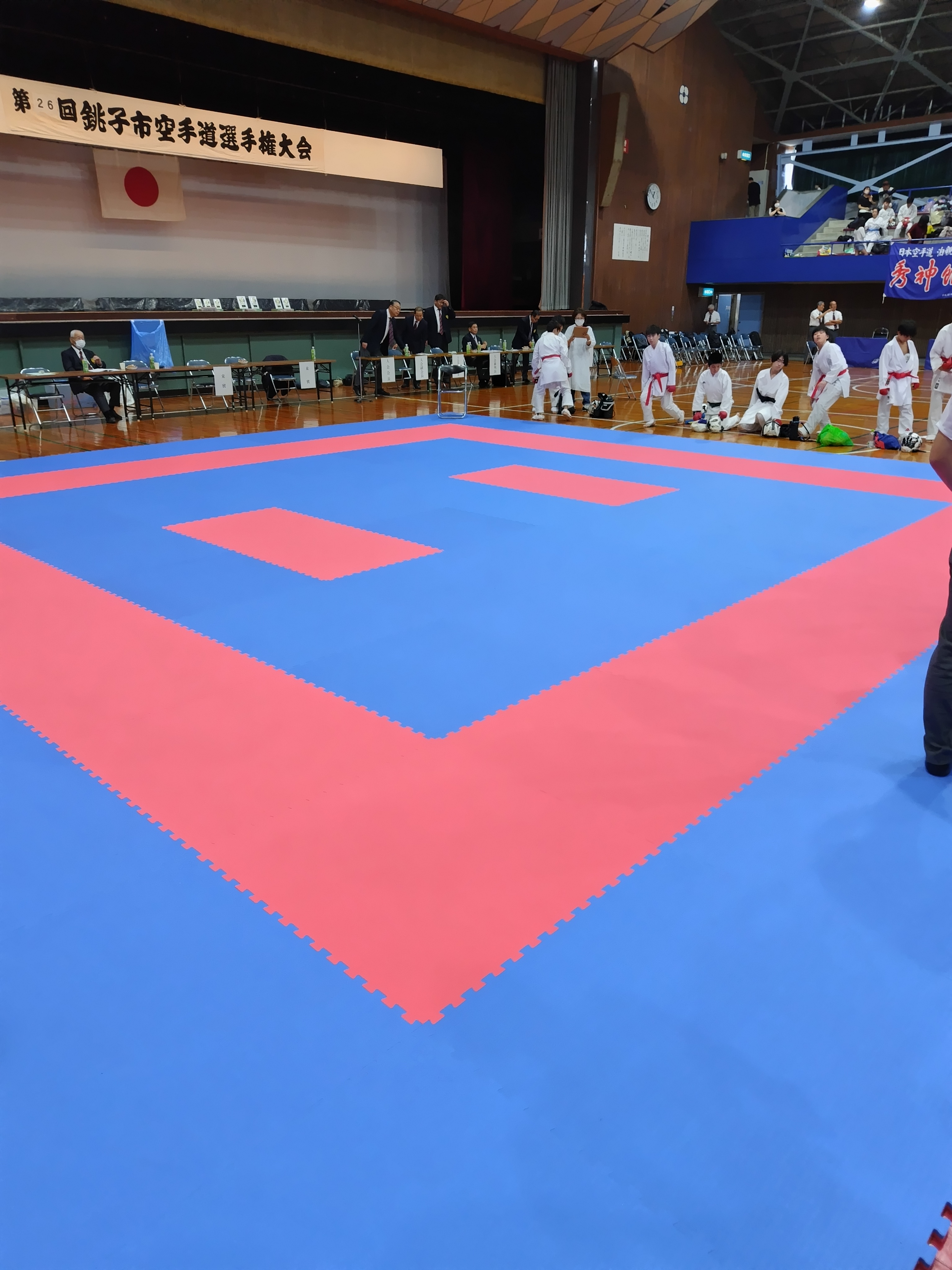 銚子市では第26回選手権大会より空手マット(WKF・全空連認定品)を導入いたしました。まだ1コート分しかありませんが、マットあると違いますね。
